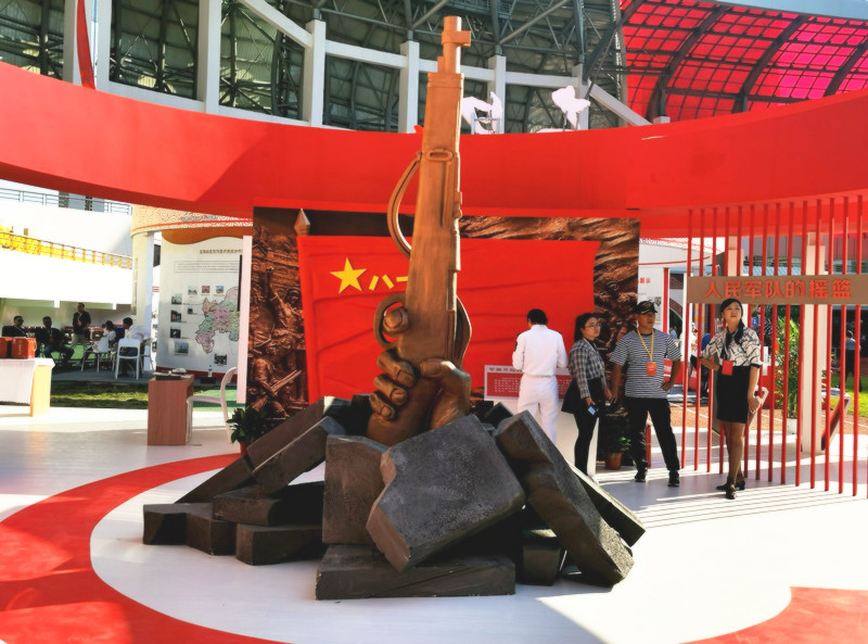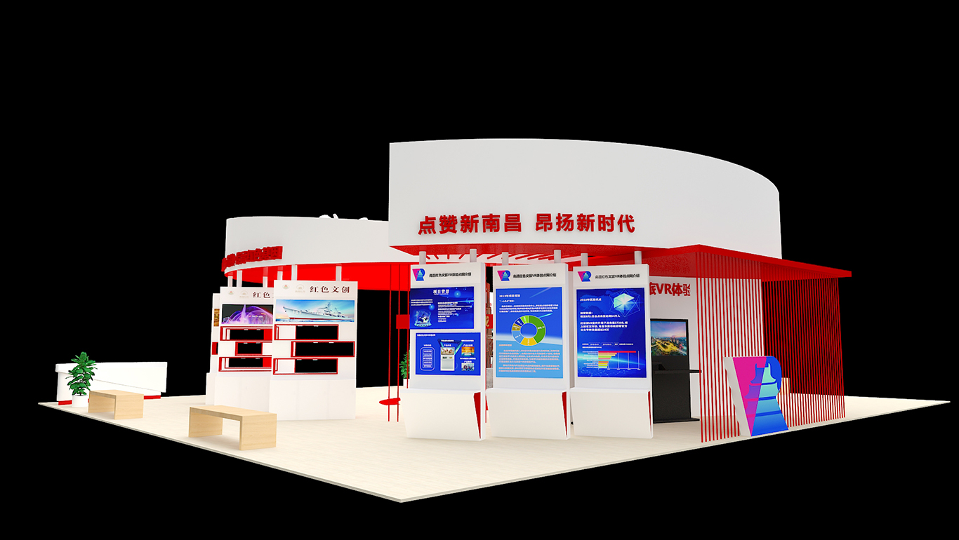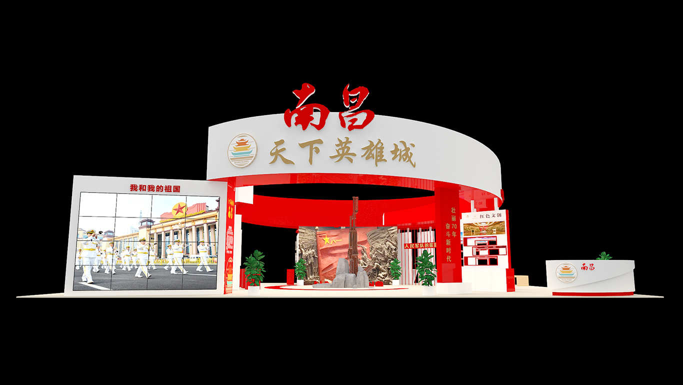 展臺總面積224平方,整個展臺是以南昌紅色文化為主導(dǎo)思想,采取不同的展板展示了八一館、新四軍舊址、滕王閣、南昌艦等的紅色文化景點(diǎn)及一些特色文創(chuàng)產(chǎn)品。南昌是人民軍隊的搖籃,是軍旗升起的地方,所以整個展臺以紅色調(diào)為主,更為突出這次展會的主題思想。